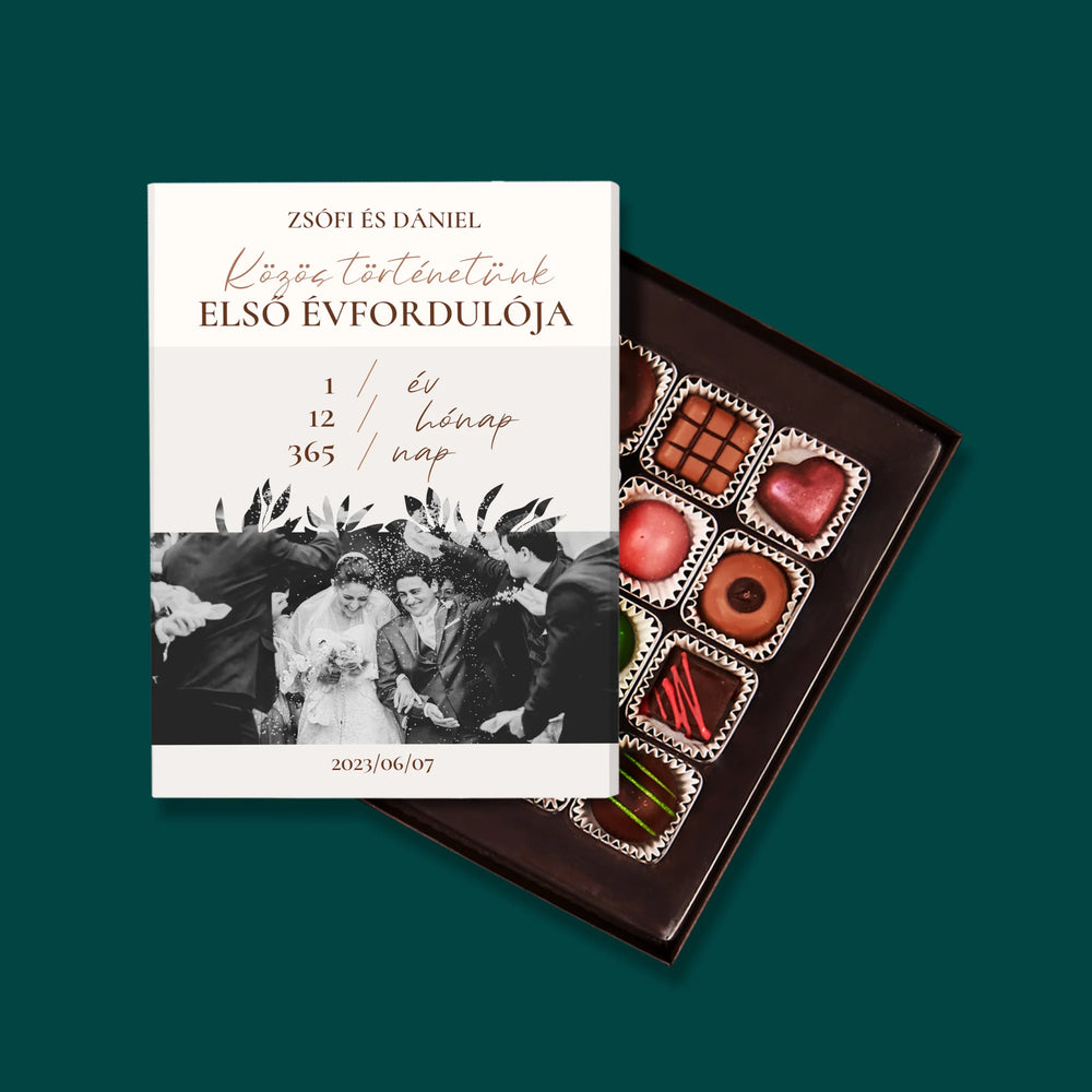 Finom belga csokoládéból készült pralinek elegáns dobozban, az általad választott személyre szabott mintával.