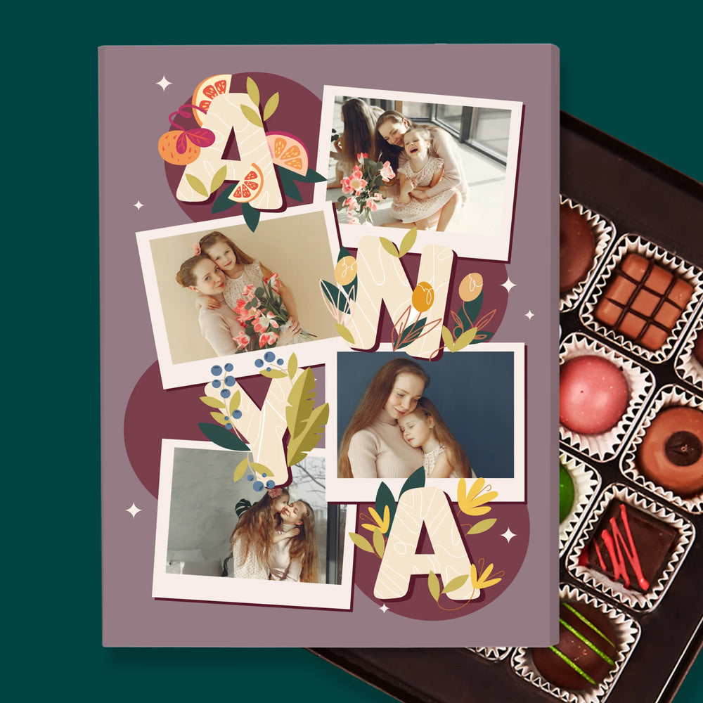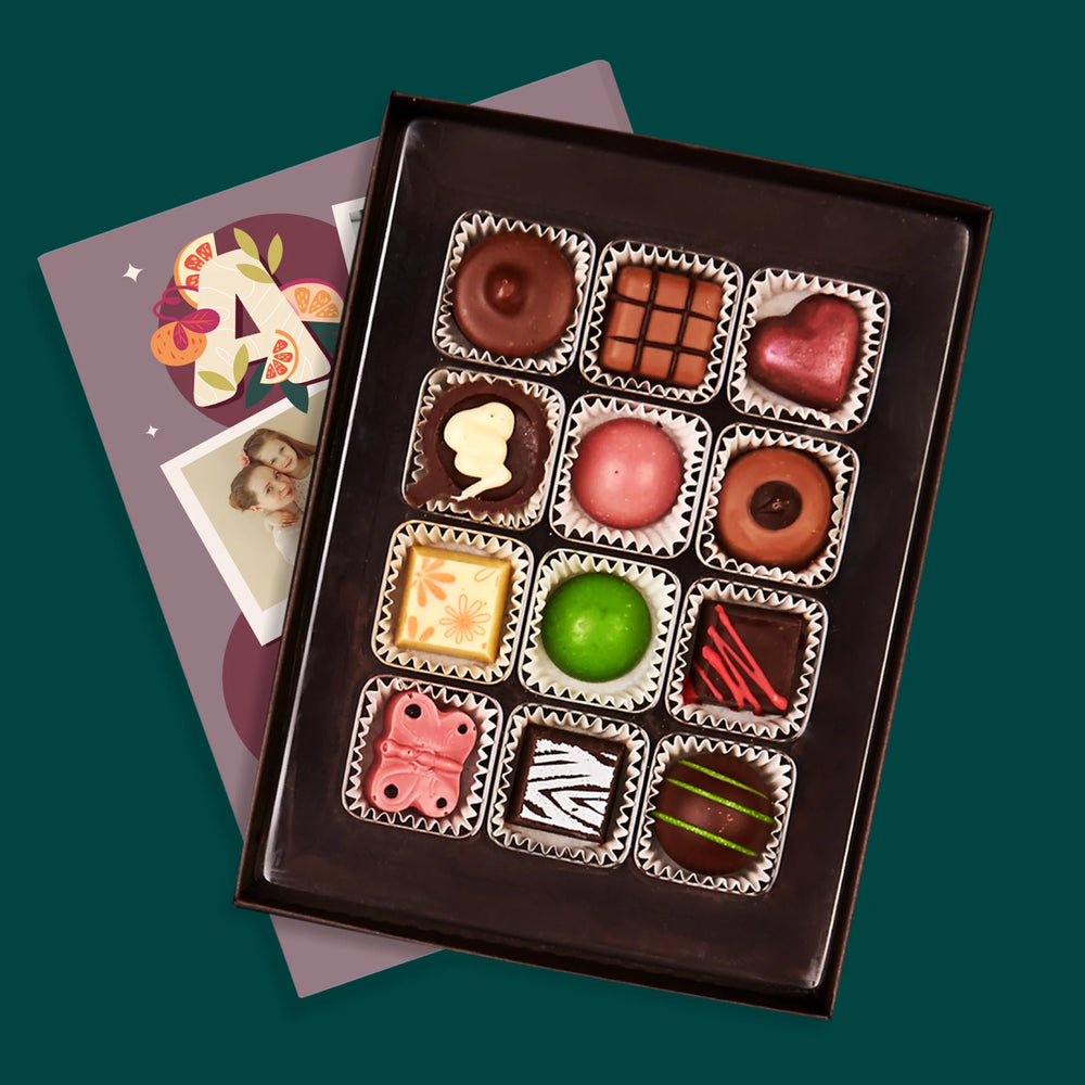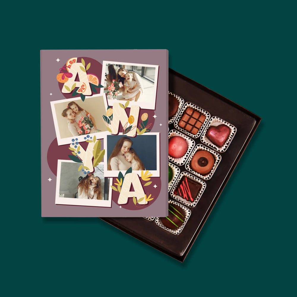 Finom belga csokoládéból készült pralinek elegáns dobozban, az általad választott személyre szabott mintával.
