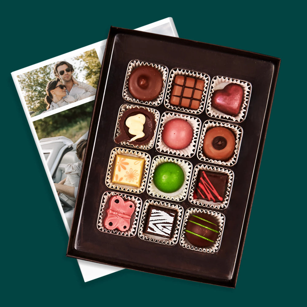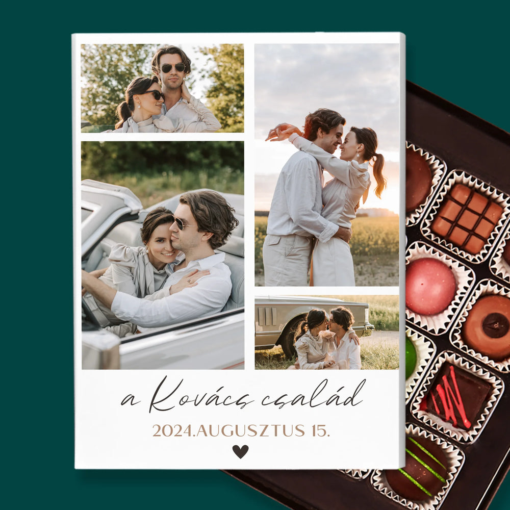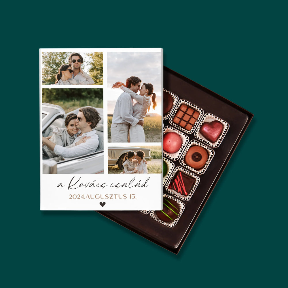 Finom belga csokoládéból készült pralinek elegáns dobozban, az általad választott személyre szabott mintával.
