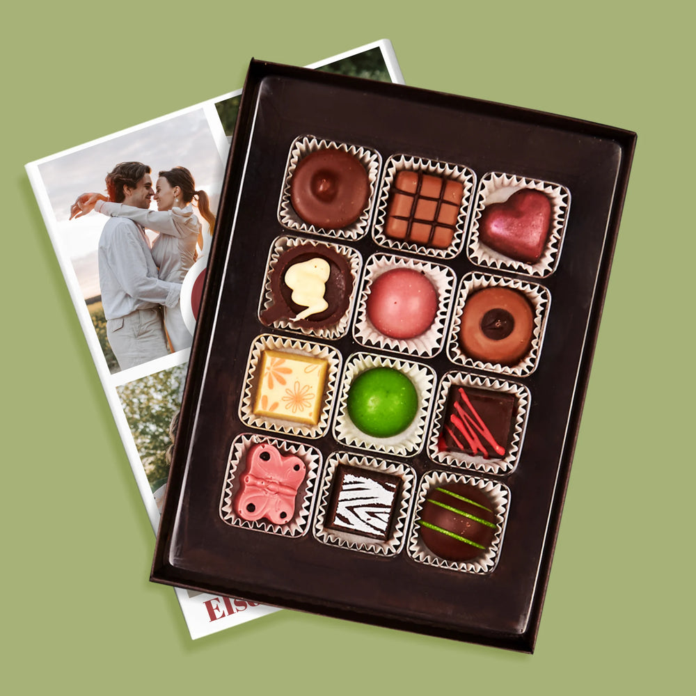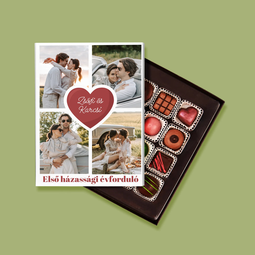 Finom belga csokoládéból készült pralinek elegáns dobozban, az általad választott személyre szabott mintával.