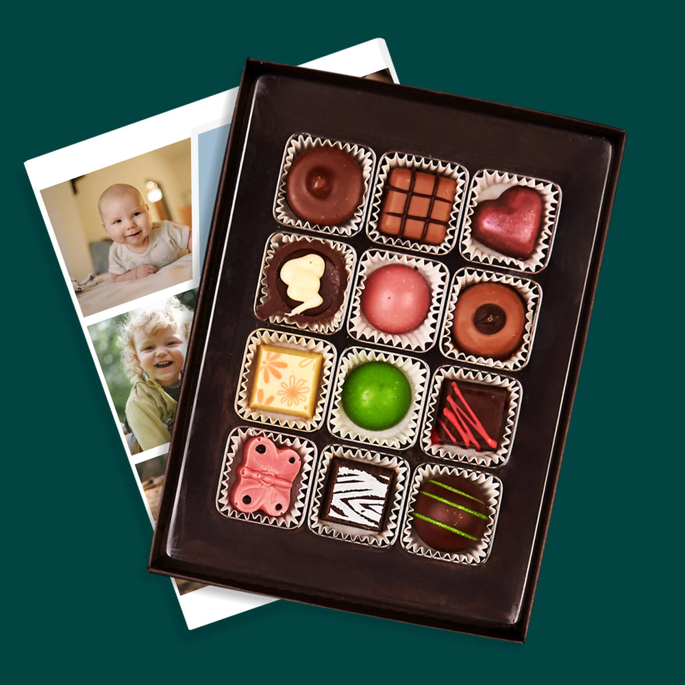 • Finom belga csokoládéból készült pralinek elegáns dobozban, az általad választott személyre szabott mintával.