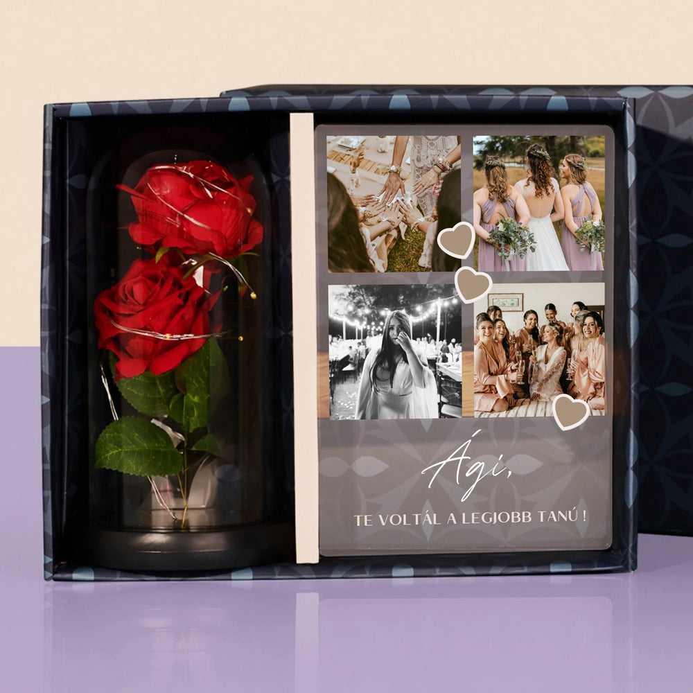 Fotókollázs: Köszönet Kollázs Képekből A Tanúnak - Ajándékkészlet üvegre nyomtatott képpel és örök rózsával