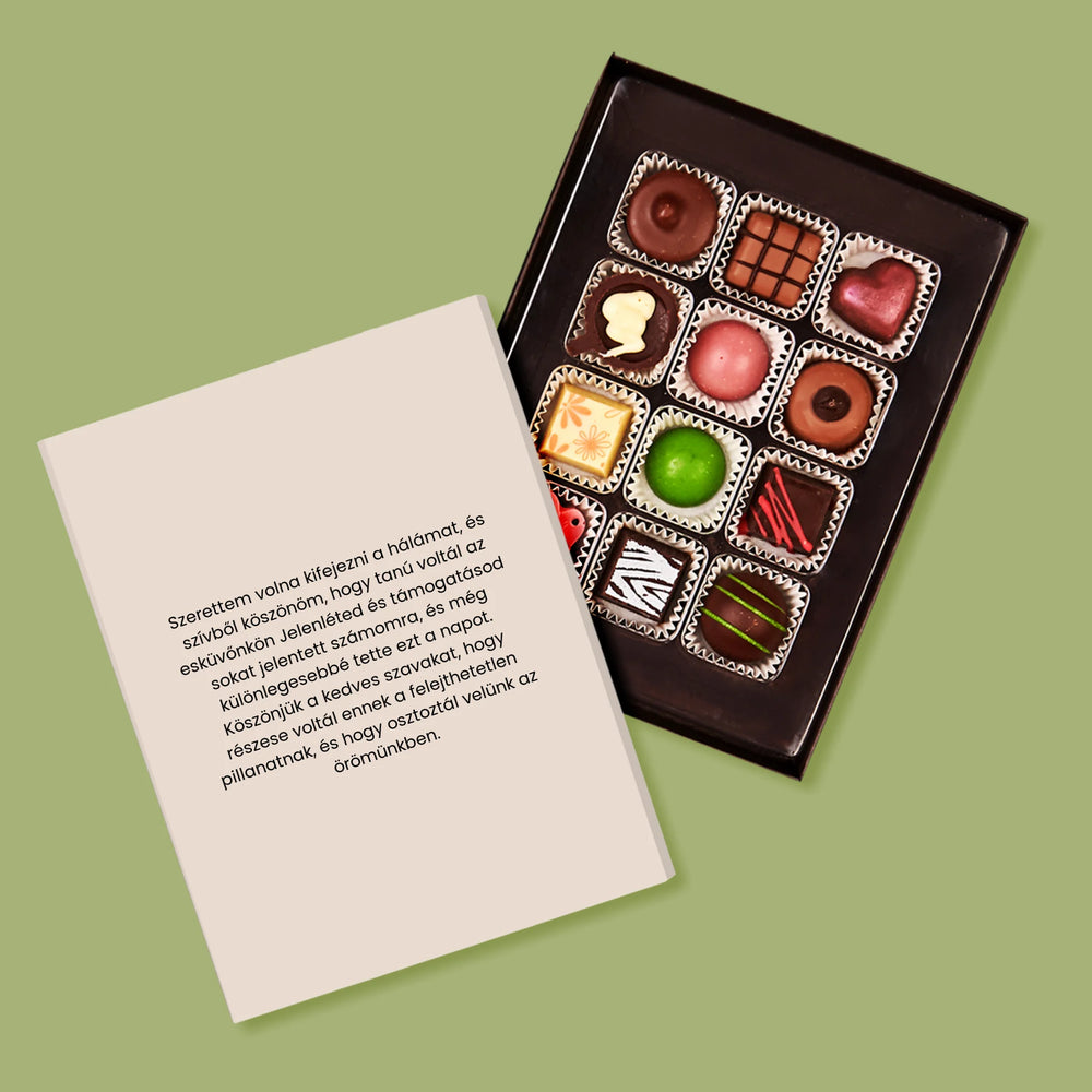 Finom belga csokoládéból készült pralinek elegáns dobozban, az általad választott személyre szabott mintával.