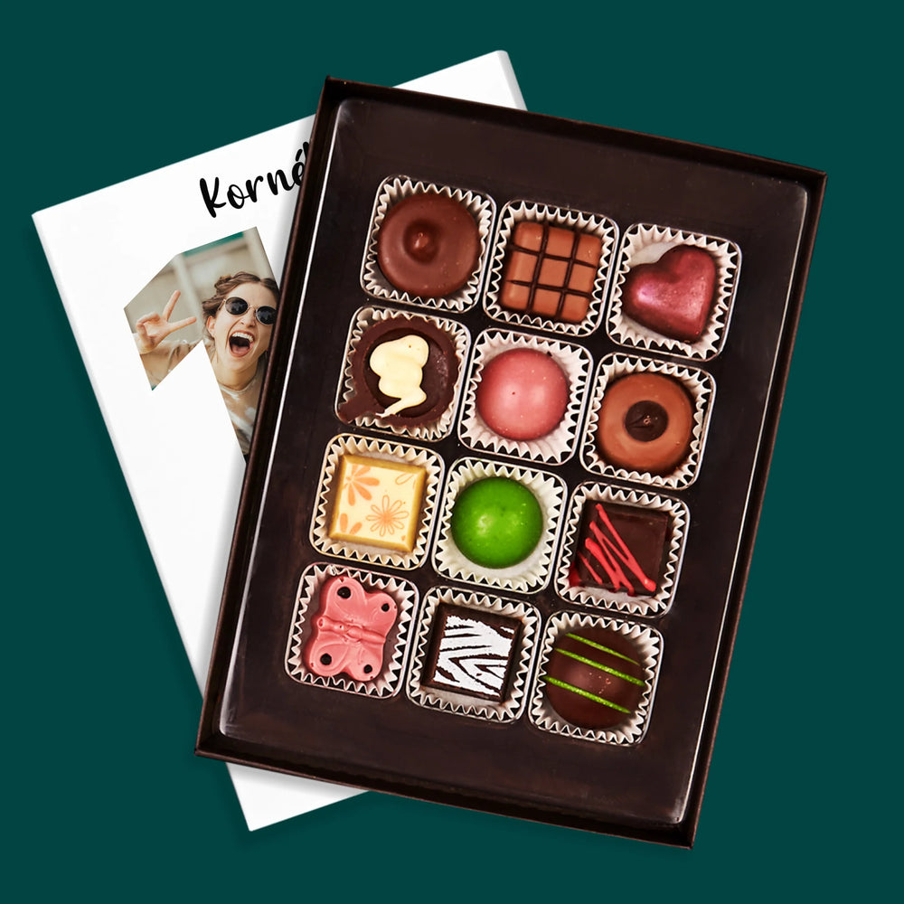 Finom belga csokoládéból készült pralinek elegáns dobozban, az általad választott személyre szabott mintával.