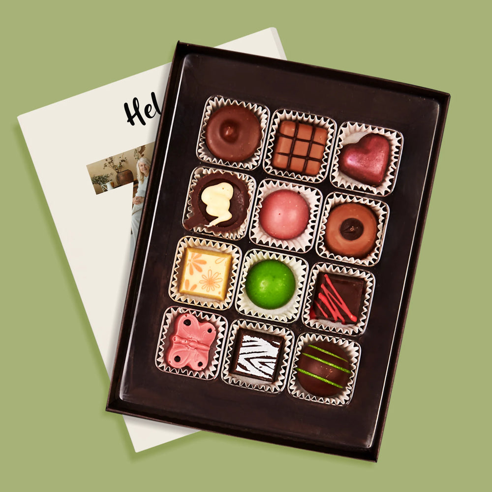 Finom belga csokoládéból készült pralinek elegáns dobozban, az általad választott személyre szabott mintával.