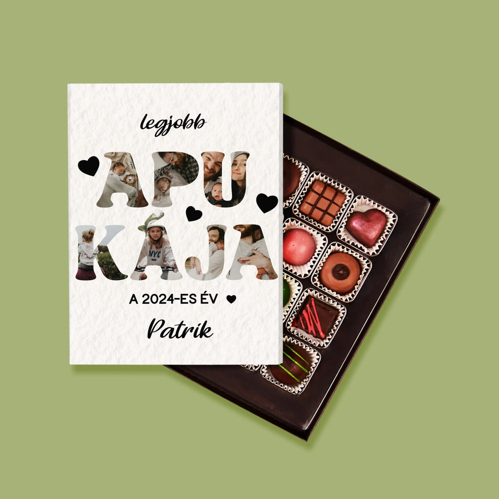 Finom belga csokoládéból készült pralinek elegáns dobozban, az általad választott személyre szabott mintával.